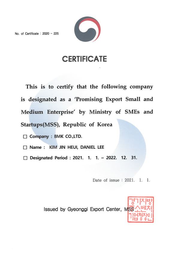 Promising Export Small and Medium Enterprise 페이지 정보 작성자 비엠케이 작성일21-01-22 10:56 조회3,283회 관련링크 이전글 다음글 목록 본문 'Promising Export Small and Medium Enterprise' by Ministry of SMEs and Startups(MSS), Republic of Korea 이전글 다음글 목록
